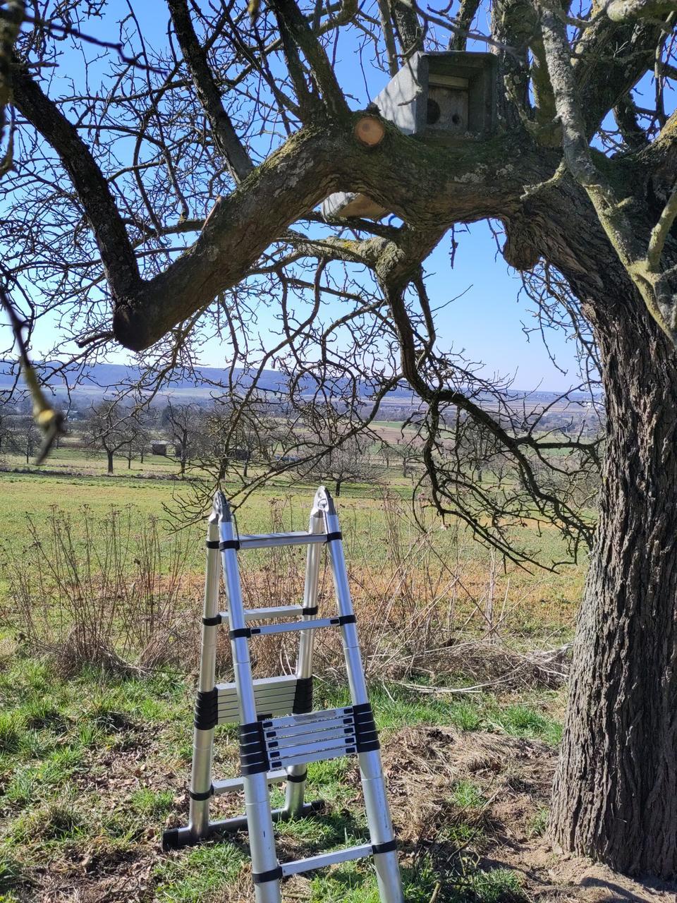 Wir haben zwei Steinkauz-Nisthöhlen in unseren Streuobstwiesen aufgestellt. Der Steinkauz braucht Baumhöhlen zum Brüten, die selten werden. Nisthöhlen helfen ihnen.